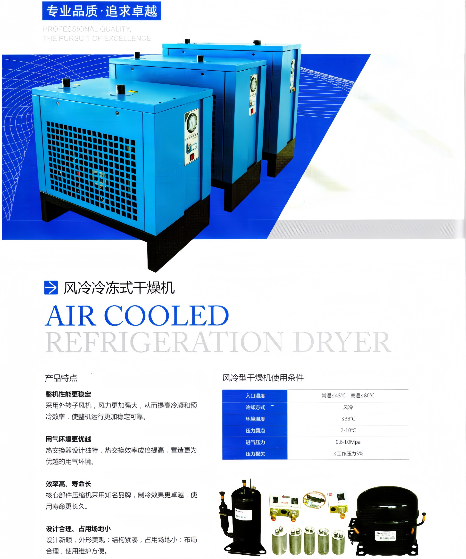产品描述:工况条件与技术指标进气温度(Inlettemperature)≤45℃冷却温度(Coolingmethod):风冷(Air-cooling)进气压力(Inletpressure):0.6~1.0Mpa压力损失(Pressuredrop):≤0.02Mpa压力露点(Dewpoint):2~10℃制···